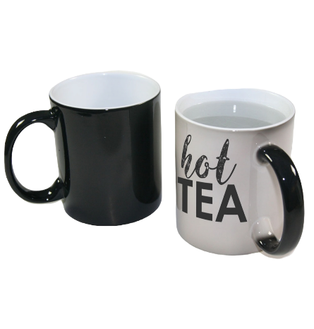 Wanneer de temperatuur van de drank daalt tot kamertemperatuur verdwijnt de opdruk en verandert de mok in een gewone zwarte mok.