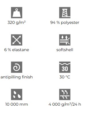 Softshell: 94% polyester, 6% elastaan TPU membraan